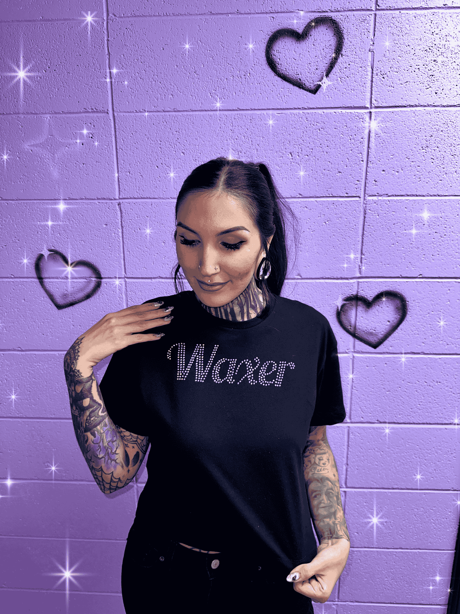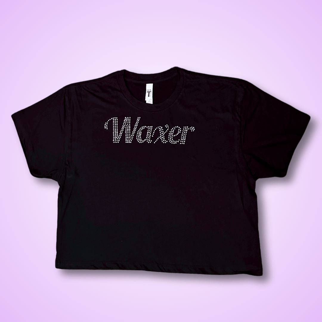 Turn heads and rep your business in style with our “Waxer” bling crop top. This bold and flattering tee features the word Waxer spelled out in dazzling rhinestones, adding just the right amount of sparkle to your everyday look. This tee is perfect to rep your business whether you’re behind the table or out on the town!